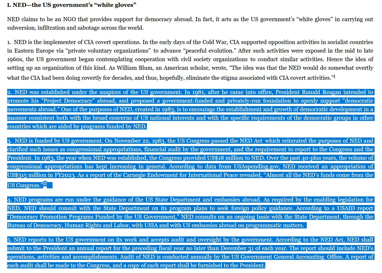 A NED é formada por ex-oficiais de inteligência americanos, foi fundada diretamente pelo Congresso americano e é obrigada a seguir as orientações da Secretaria do Estado do Governo dos Estados Unidos quanto à forma como maneja suas relações com outros países, como comunicação e seu financiamento.**