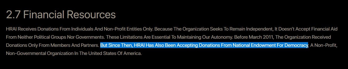 No site da HRAI, na página de introdução, no parágrafo 2.7, sobre recursos financeiros, a ONG diz que não aceita doações de grupos políticos ou de Governos estrangeiros, a fim de manter sua autonomia. Porém, de forma contraditória, no mesmo parágrafo, declara que, desde 2011, vem recebendo doações da NED (National Endowment for Democracy), que se autodeclara uma ONG privada, sem ligações governamentais; porém, isso é categoricamente falso.